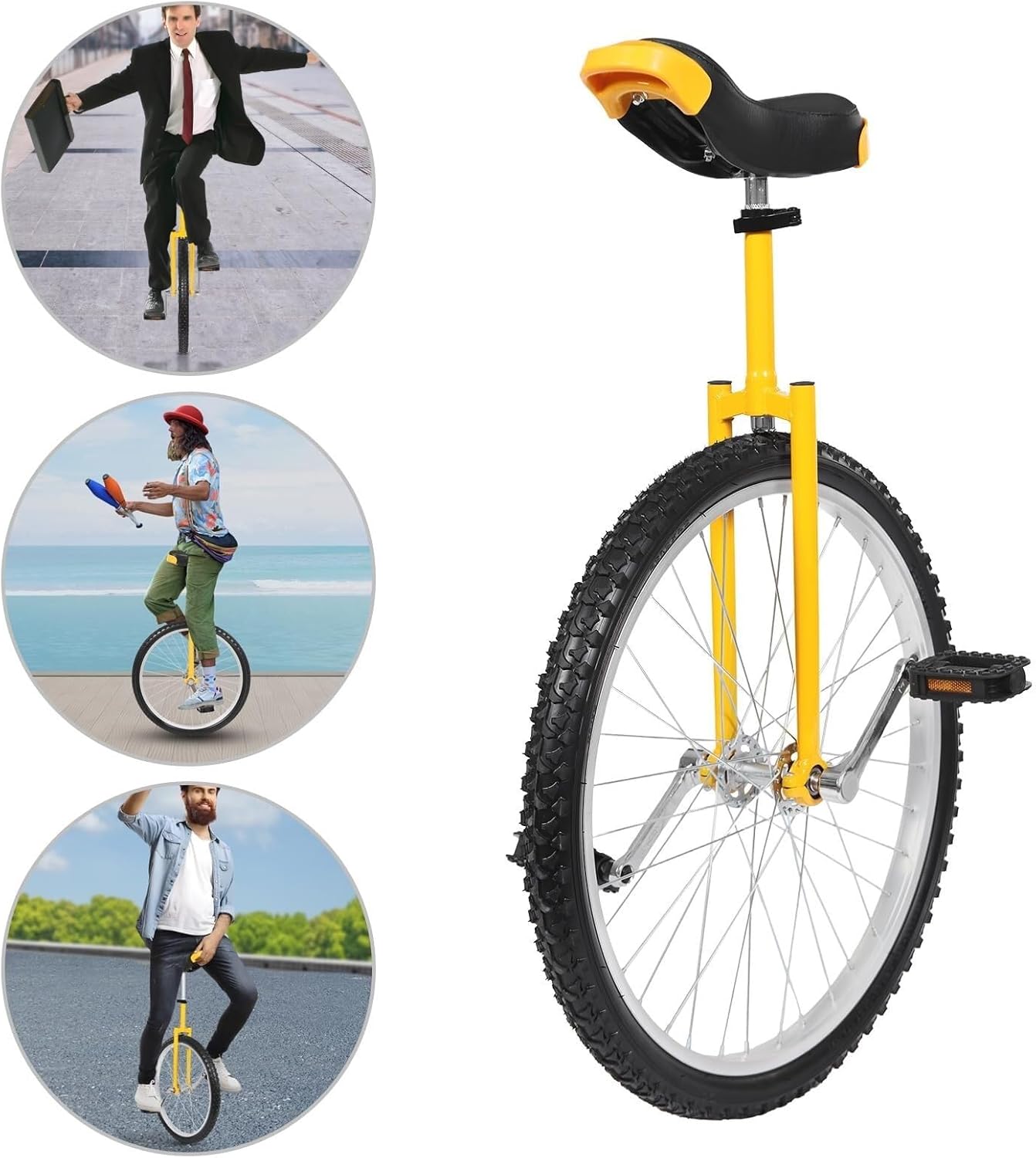 Color: YellowMaterial: Steel, Rubber, PU, Stainless SteelStyle: ModernAssembly Required: YesMaximum Weight Limit: Approx. 80 kg/176 lbsRecommended Users: UnisexSuitable for Height: 175 cm/69 inches and aboveSteel Spokes: 36Sports Type: CyclingWheel Diameter: 60 cm/24 inchesWheel Width: 5.4 cm/2.13 inchesProduct Height Range: 83-95 cm/32-37 inchesGross Weight: 5.6 kg/12 lbsPackage Size: 58*18.5*63 cm/22*7*24 inchesPackage Included1*Unicycle Frame1*Unicycle Seat1*Wheel2*PedalsOther Assembly Accessories